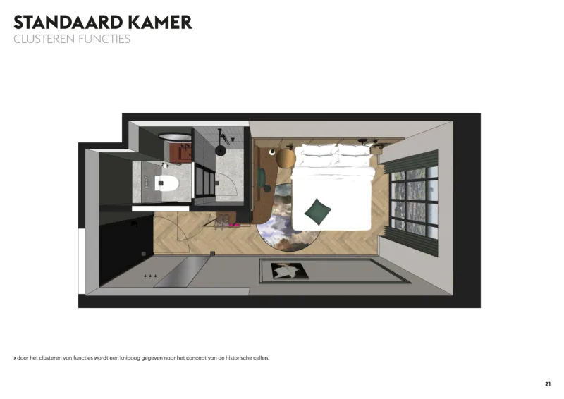 De monumentale knusse directie woningen en de boven etage van het centrale entree gebouw bieden verschillende prachtige en karakteristieke verblijfs ruimtes van verschillende formaten van grotere loft achtige ruimtes tot compacte knusse pension kamers. Met behoud van originele details en in nauwe samenspraak met de monumenten commissie zijn de ruimtes en detailleringen tot stand gekomen die voldoen aan de huidige strenge maatstaven van gast verblijven.